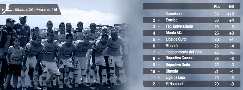 Elsewhere, Emelec confirmed their involvement in next years Copa Libertadores by winning 2-1 at home against El Nacional while Olmedo cemented their relegation to Segunda B after another home loss, this time to Deportivo Cuenca.